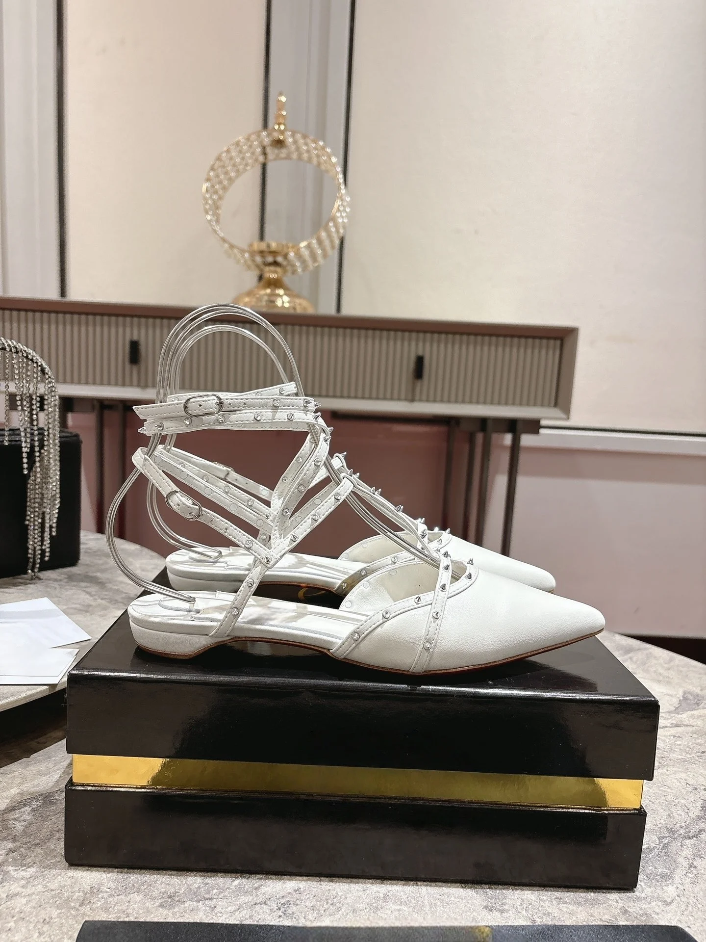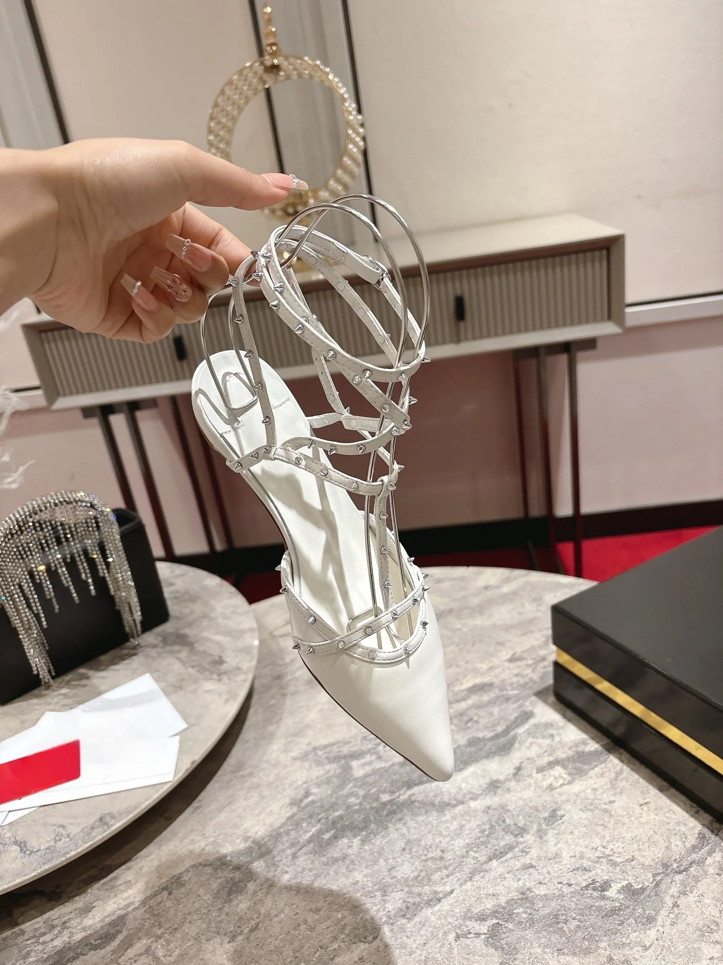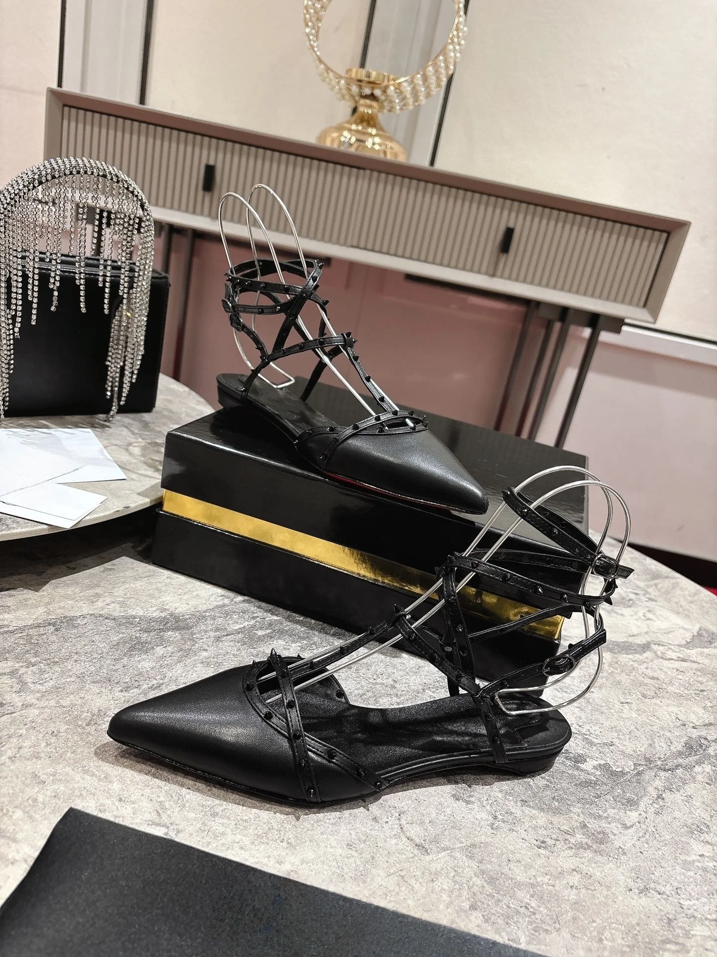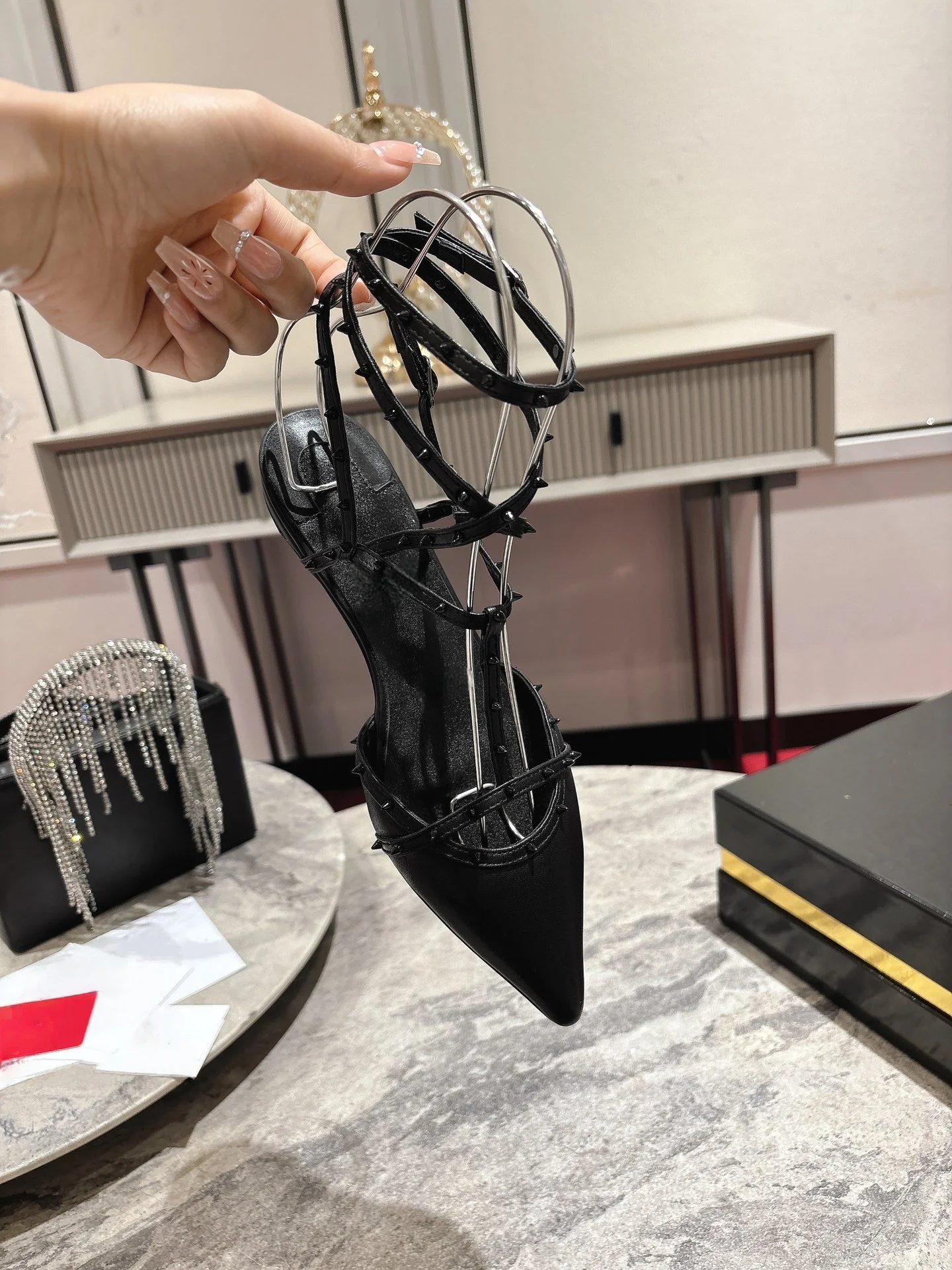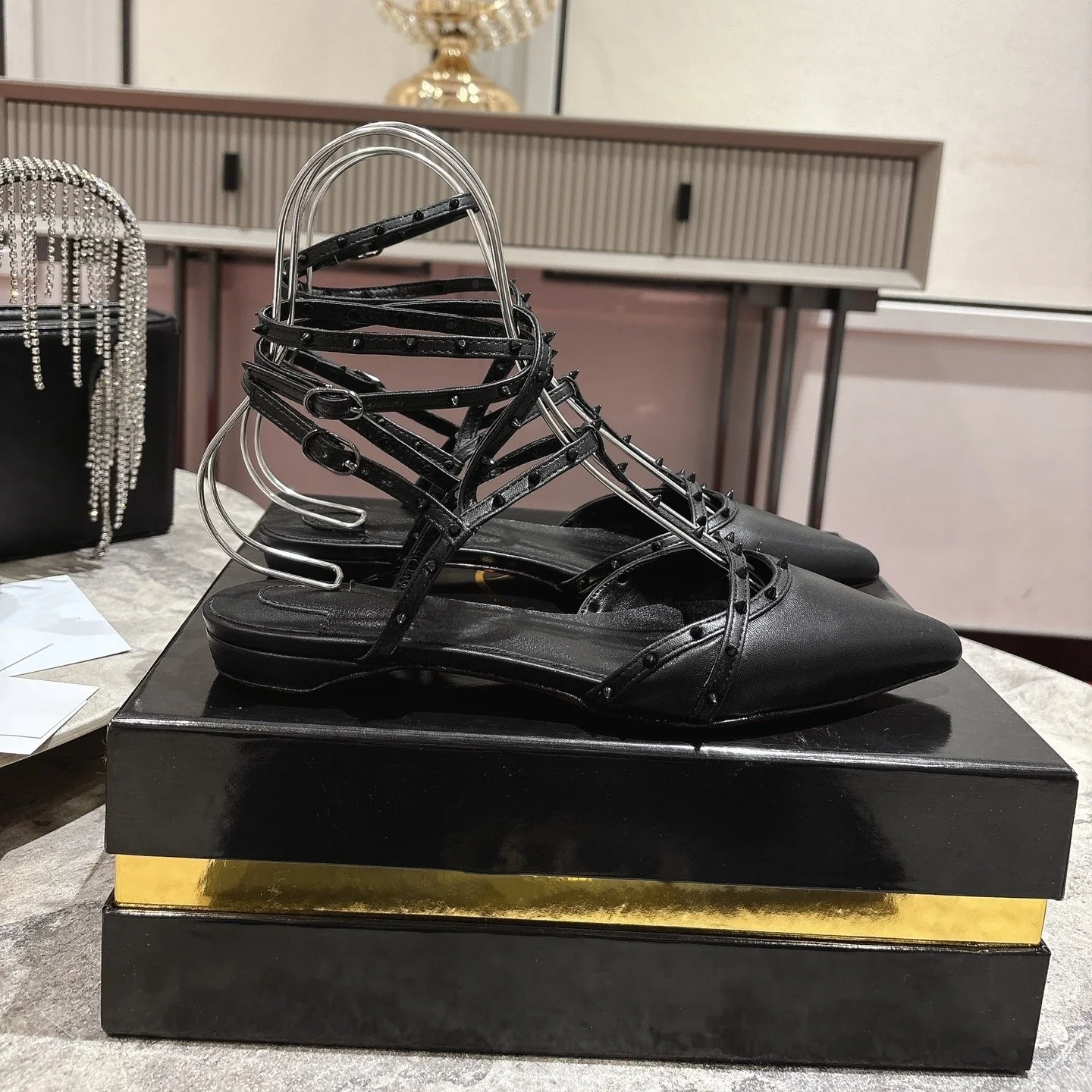 2025 Summer New Women's Wrap Toe Sandals Pointed Toe Low Heel Flat Bottom Thin Strap Combination Rivet Punk Ladies Casual Shoes