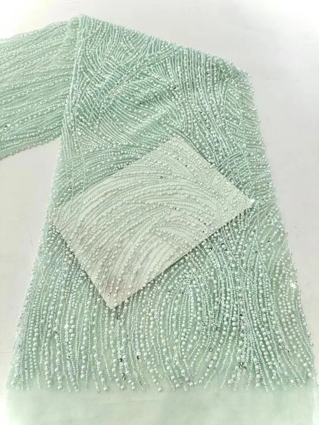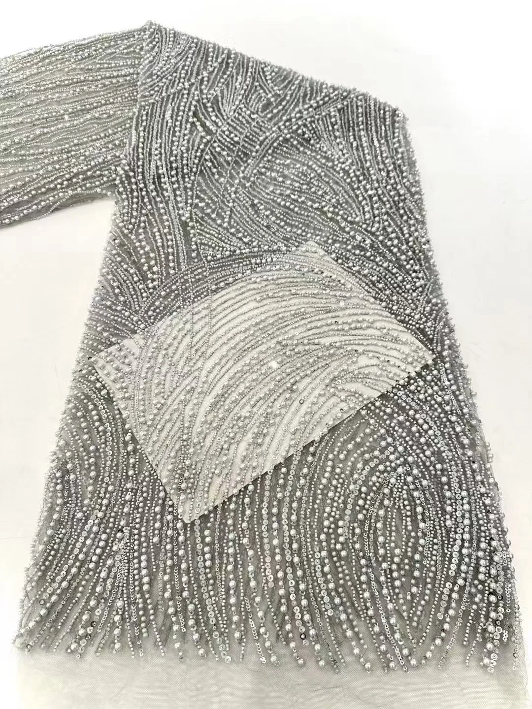 This lace is absolutely stunning! The 3D flowers pop and the beading is super detailed. It feels really nice and expensive, perfect for a fancy dress.
