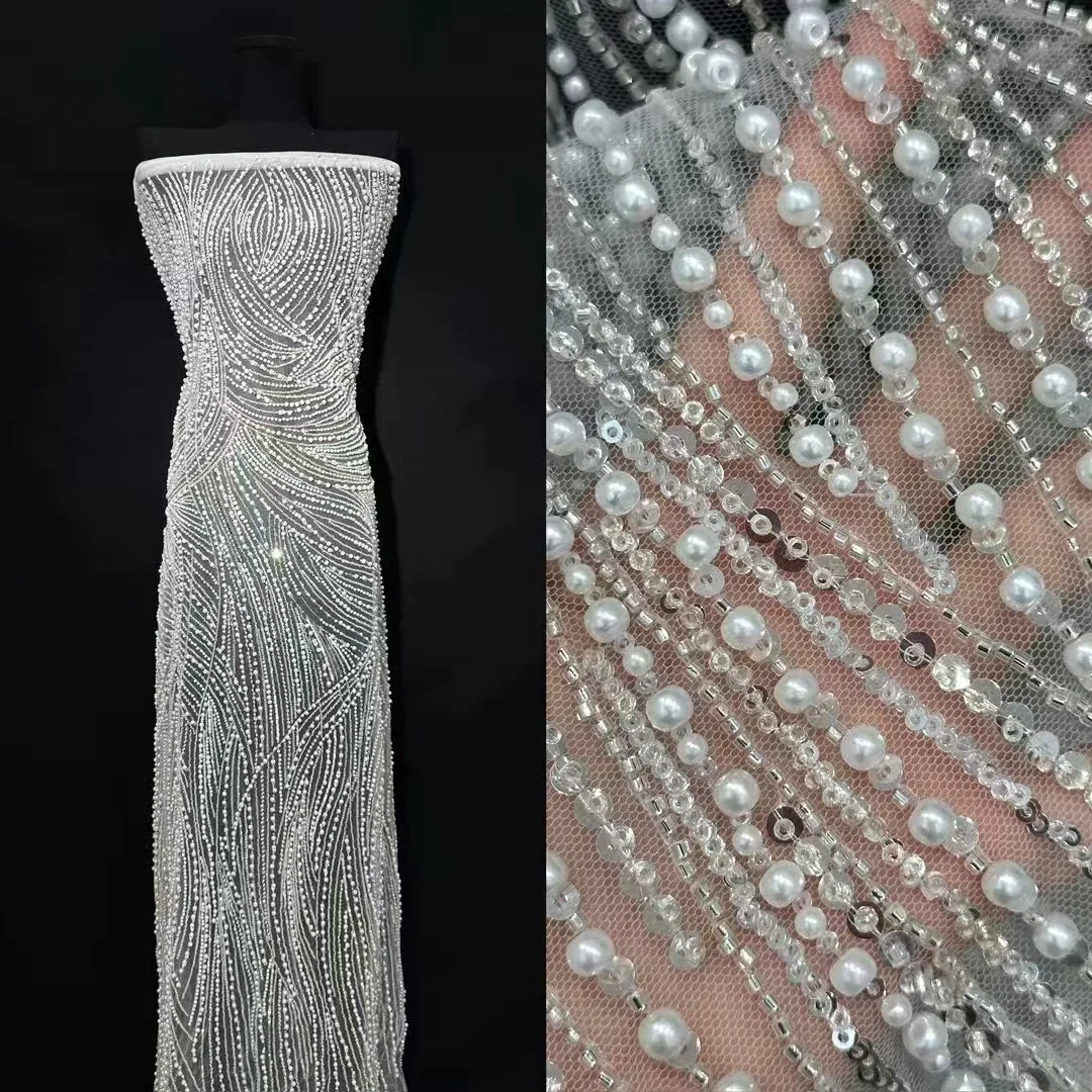 African Lace Fabric 2025 High Quality French 3D Flower white Embroidery Beads Tulle Lace Fabric For Party Dress