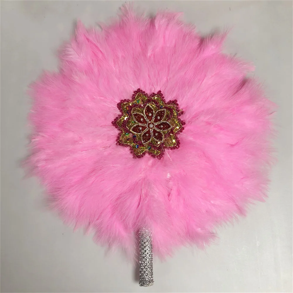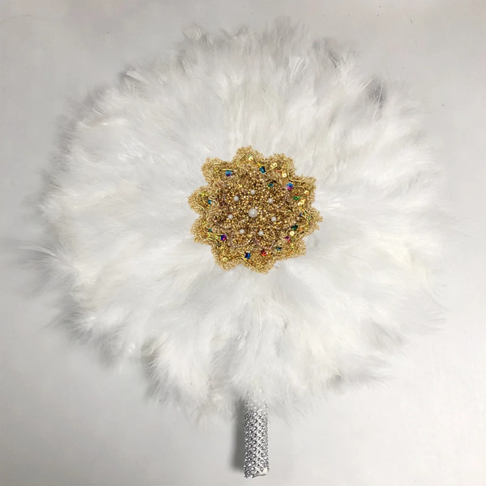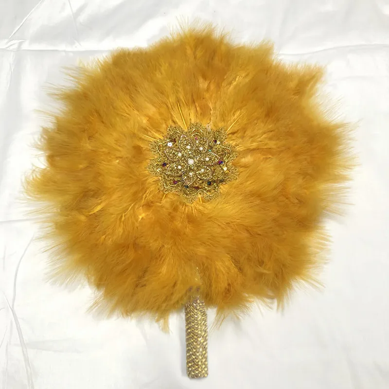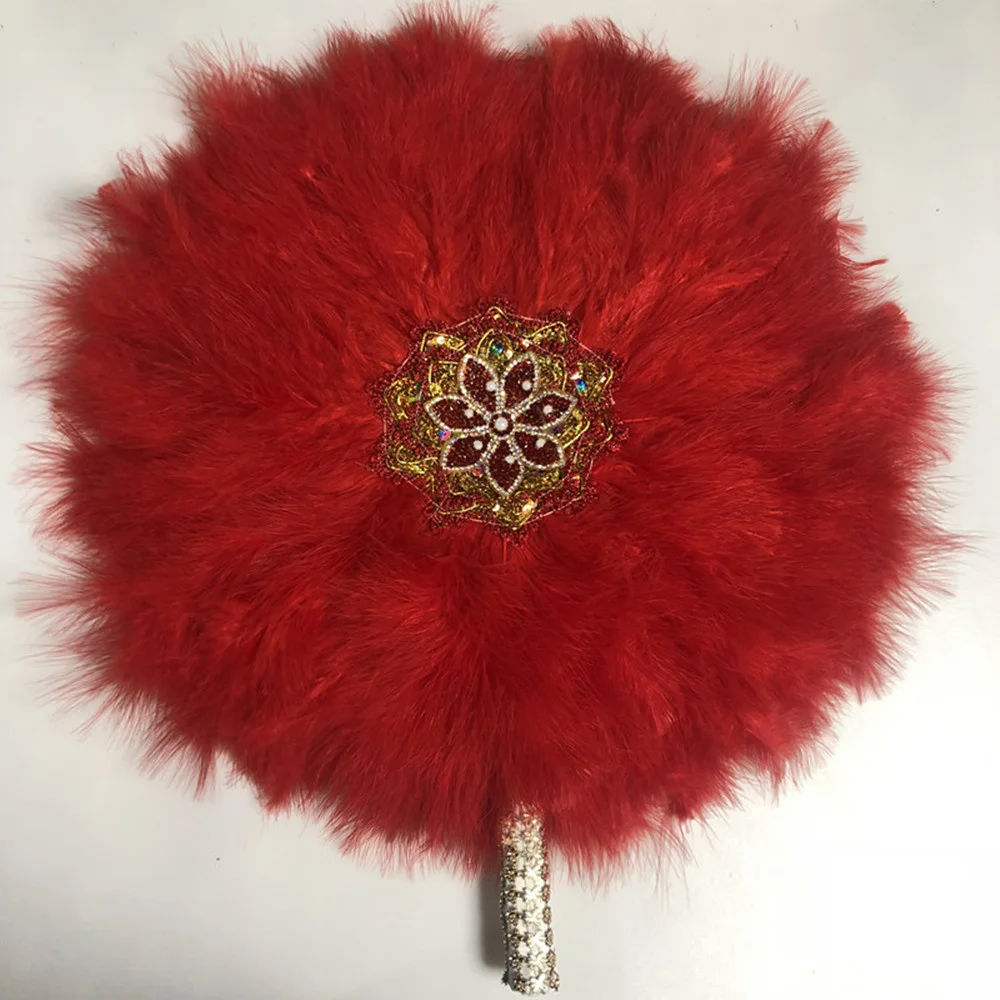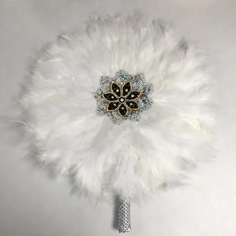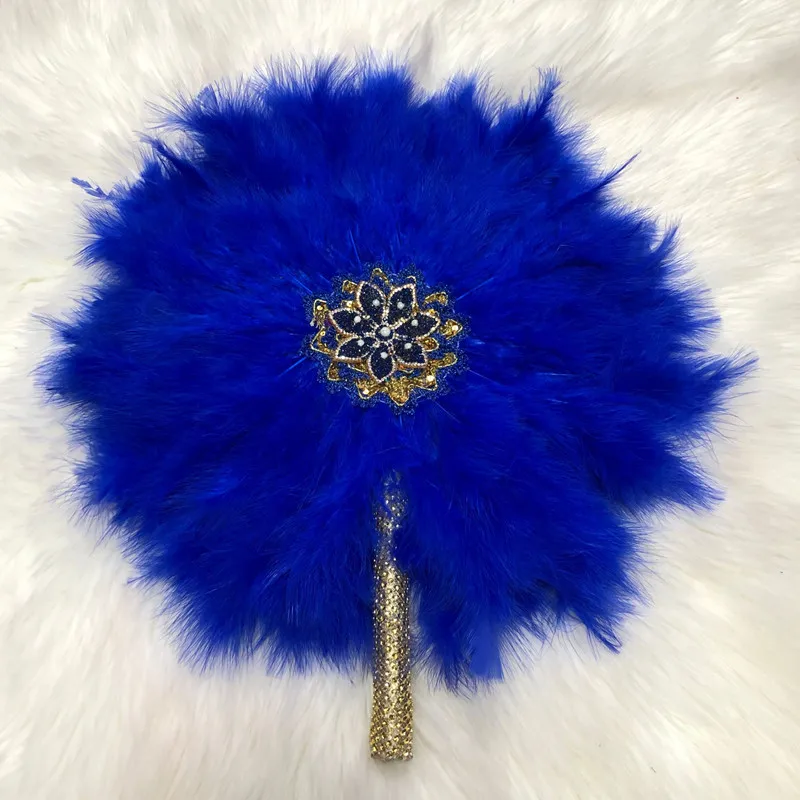 This exquisite double-sided African turkey feather fan, adorned with shimmering stones, adds a touch of elegance to weddings and dance performances. Handcrafted for unique beauty, its lightweight design ensures comfortable handling and graceful movement