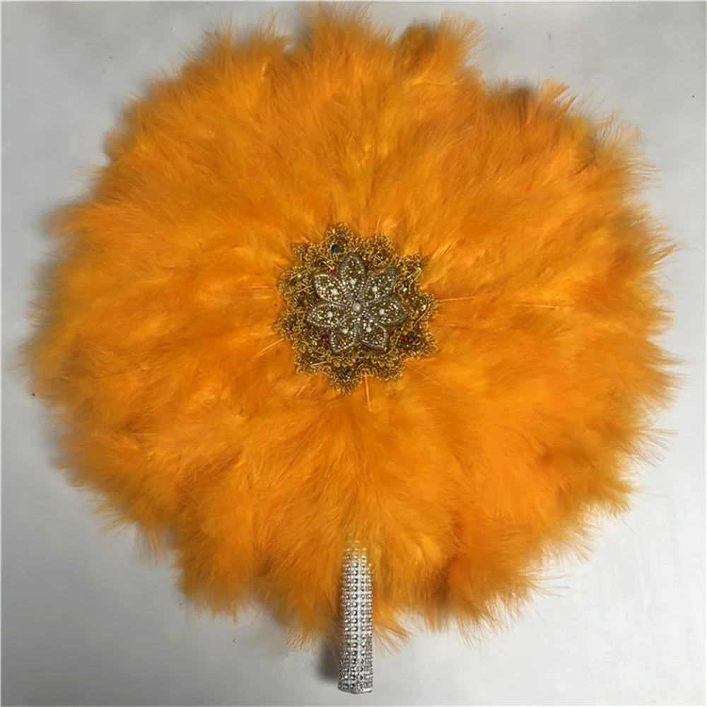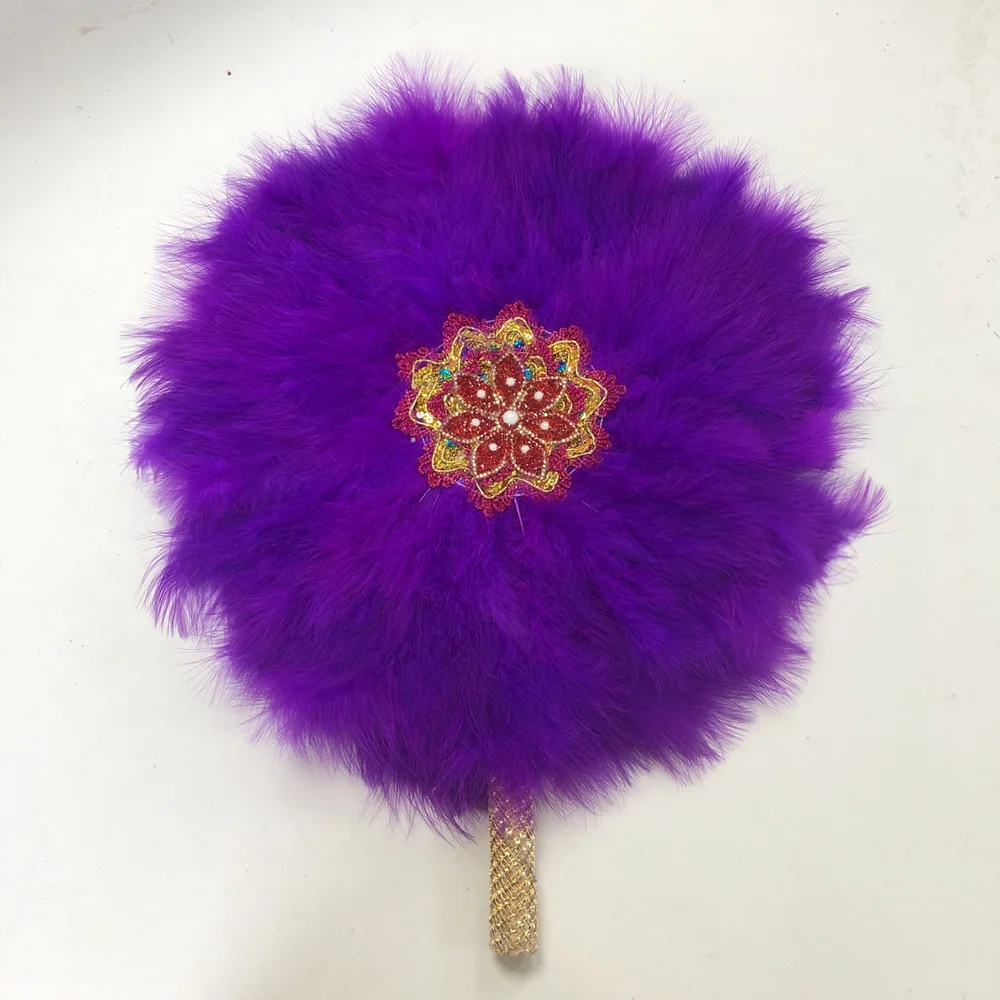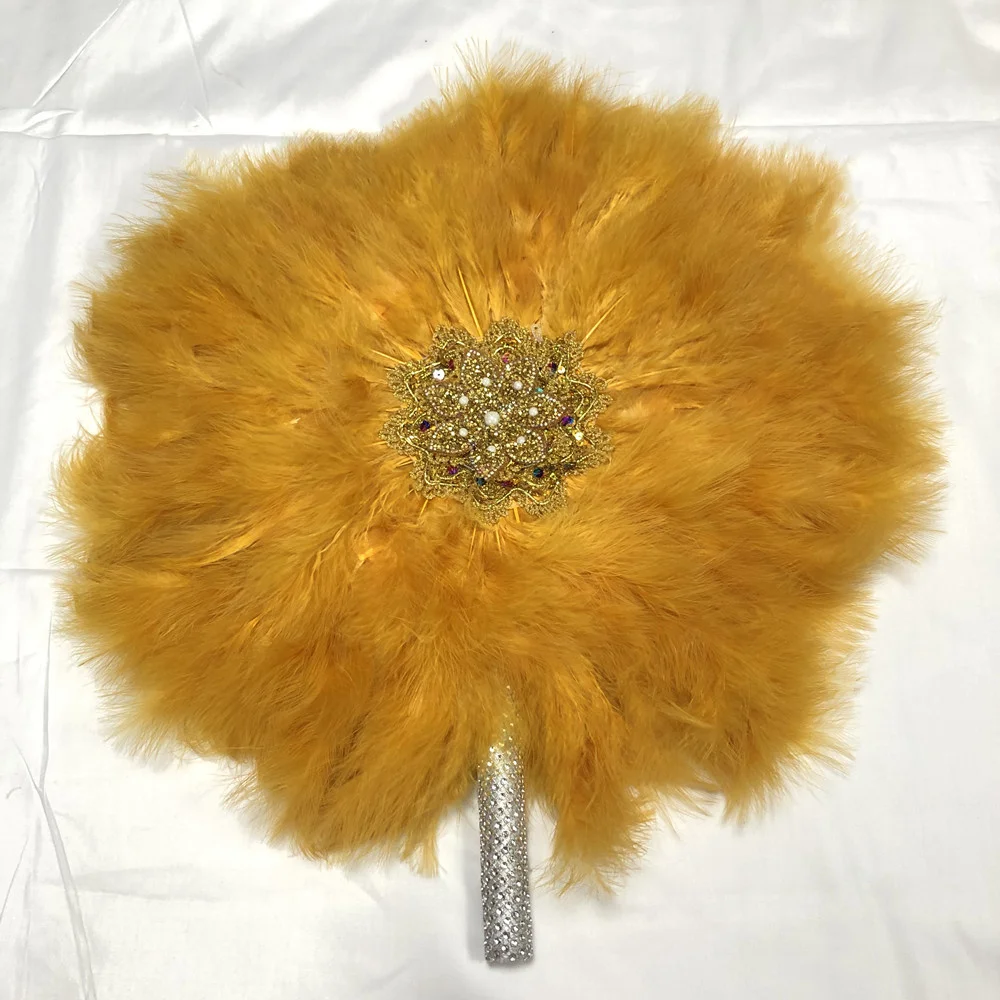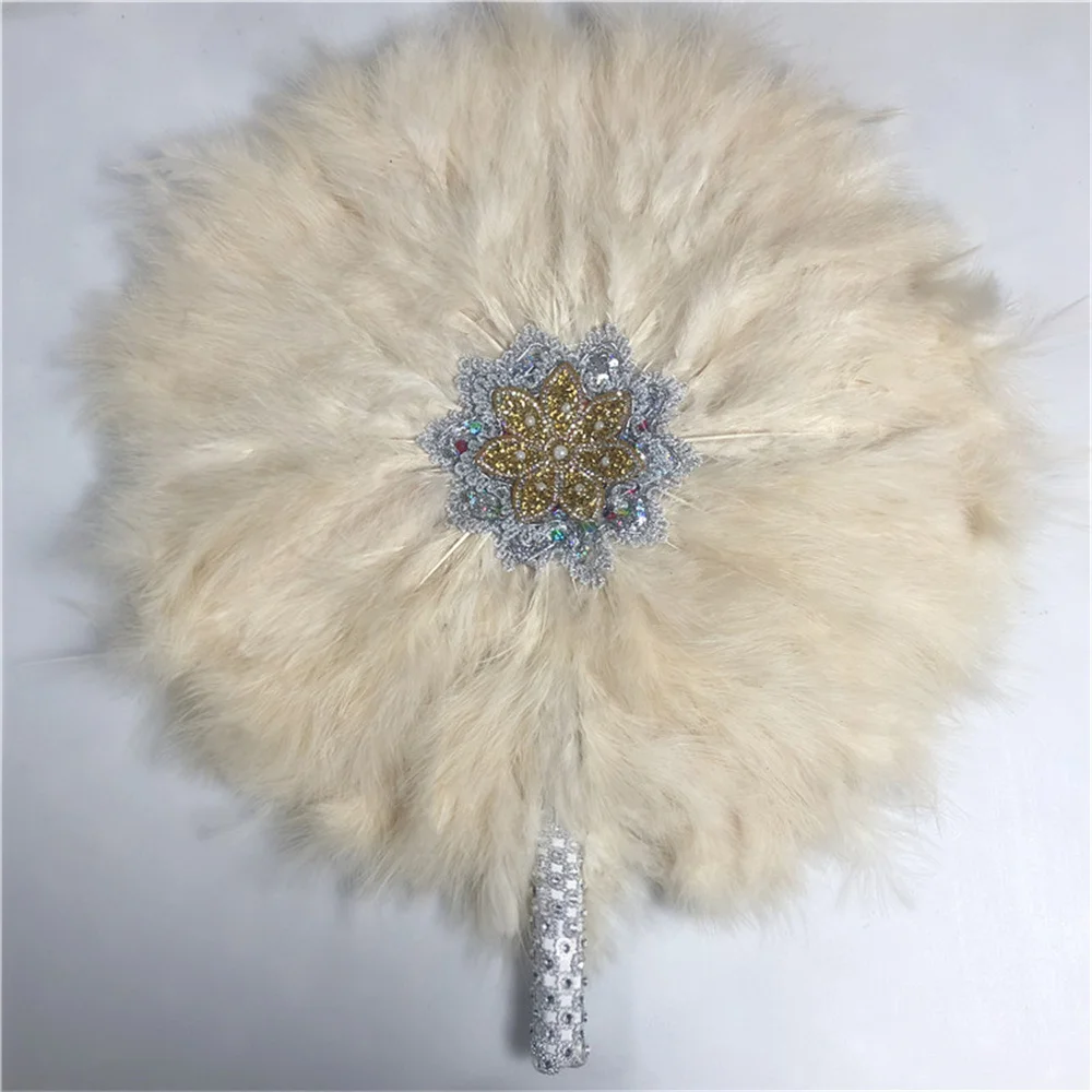 This exquisite double-sided African turkey feather fan, adorned with shimmering stones, adds a touch of elegance to weddings and dance performances. Handcrafted for unique beauty, its lightweight design ensures comfortable handling and graceful movement