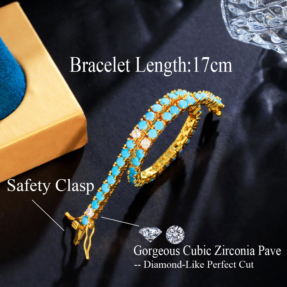 CWWZircons New Fashion 3mm Round Blue Turquoises Stone Classic Tennis Chain Bracelets for Women Girl Gold Plated Jewelry CB337