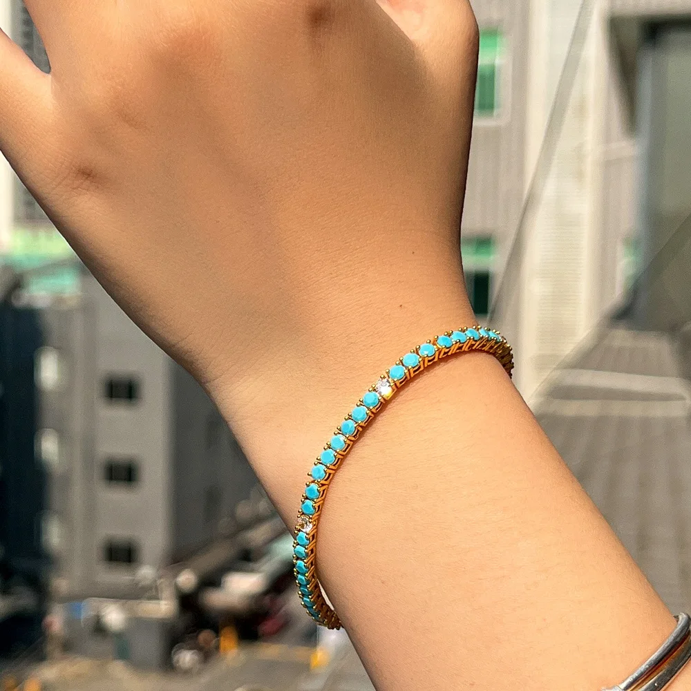This turquoise tennis bracelet is super cute! It’s delicate and sparkly, perfect for everyday wear. The blue stones are a beautiful color and the gold plating looks great. Love it!