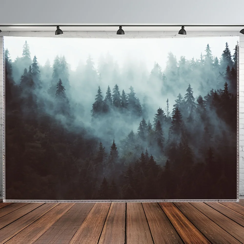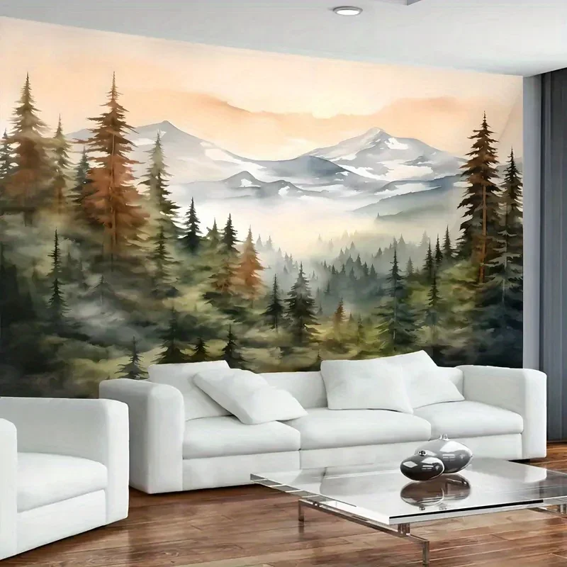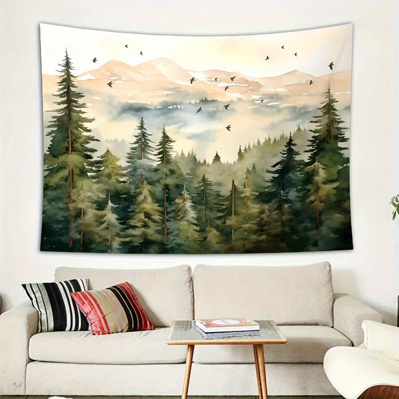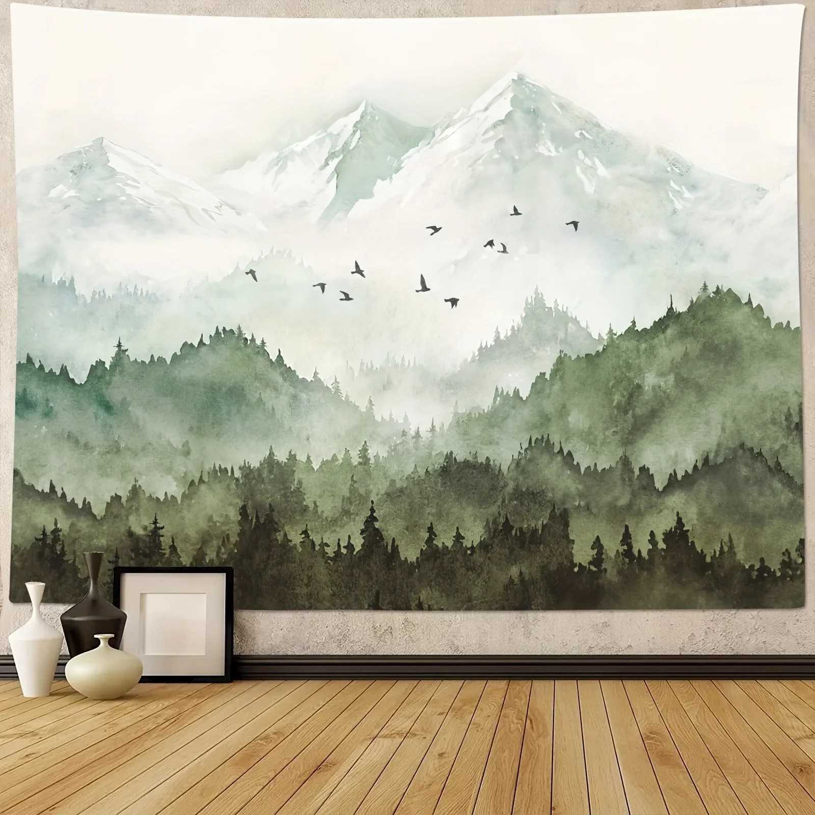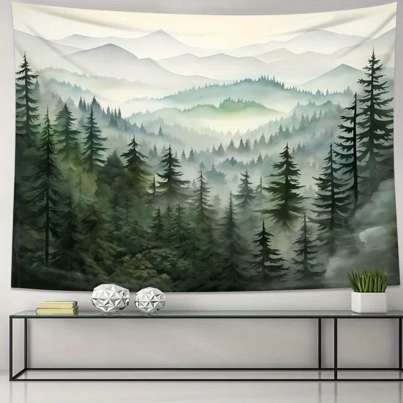 Foggy forest and mountains tapestry watercolor landscape wall hanging aesthetic sage green decor for bedroom and living room