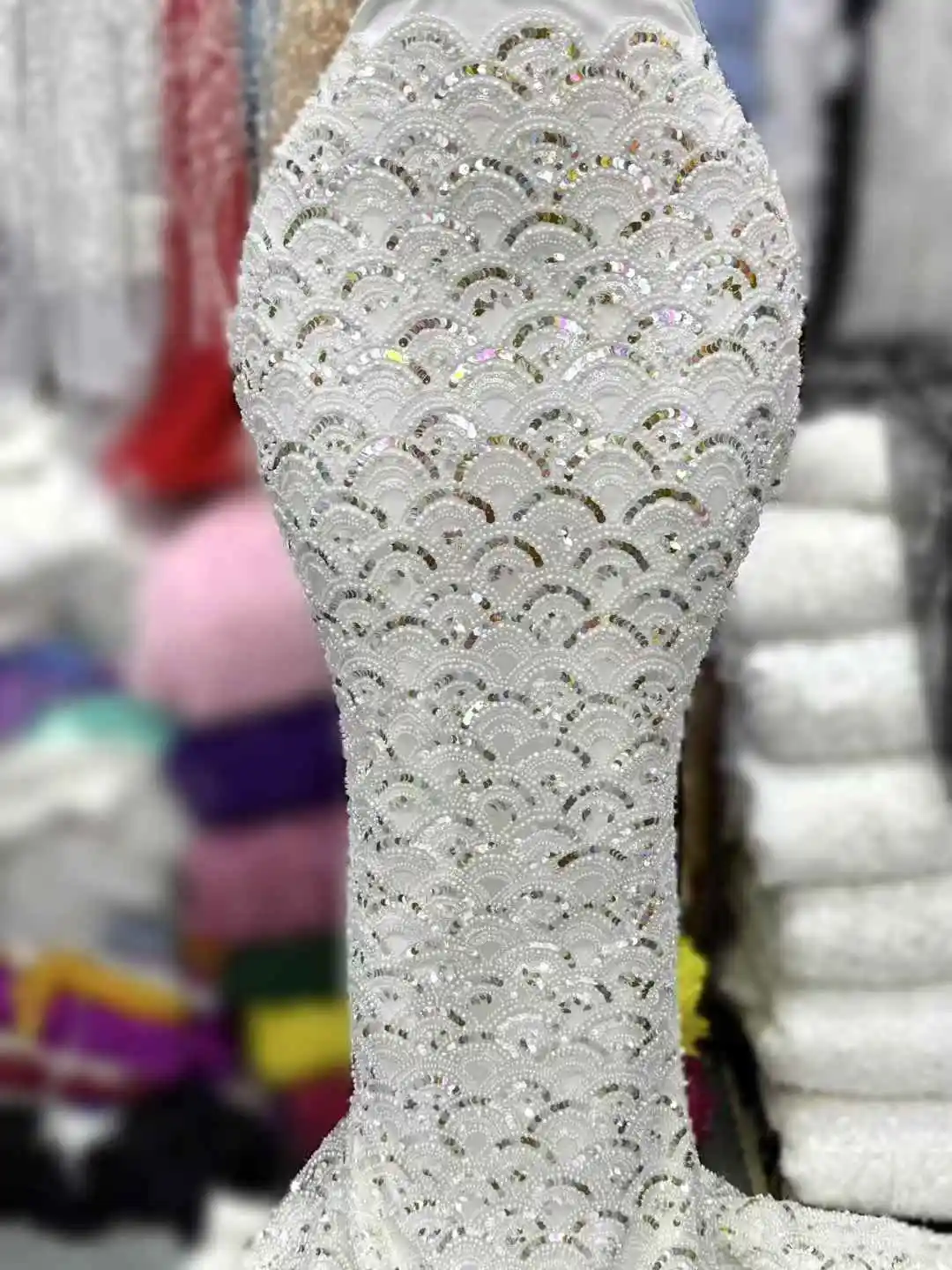 Welcome to our May Lace factory! We are professional factory in Chinese biggest wedding dress Material & evening dress market Material.