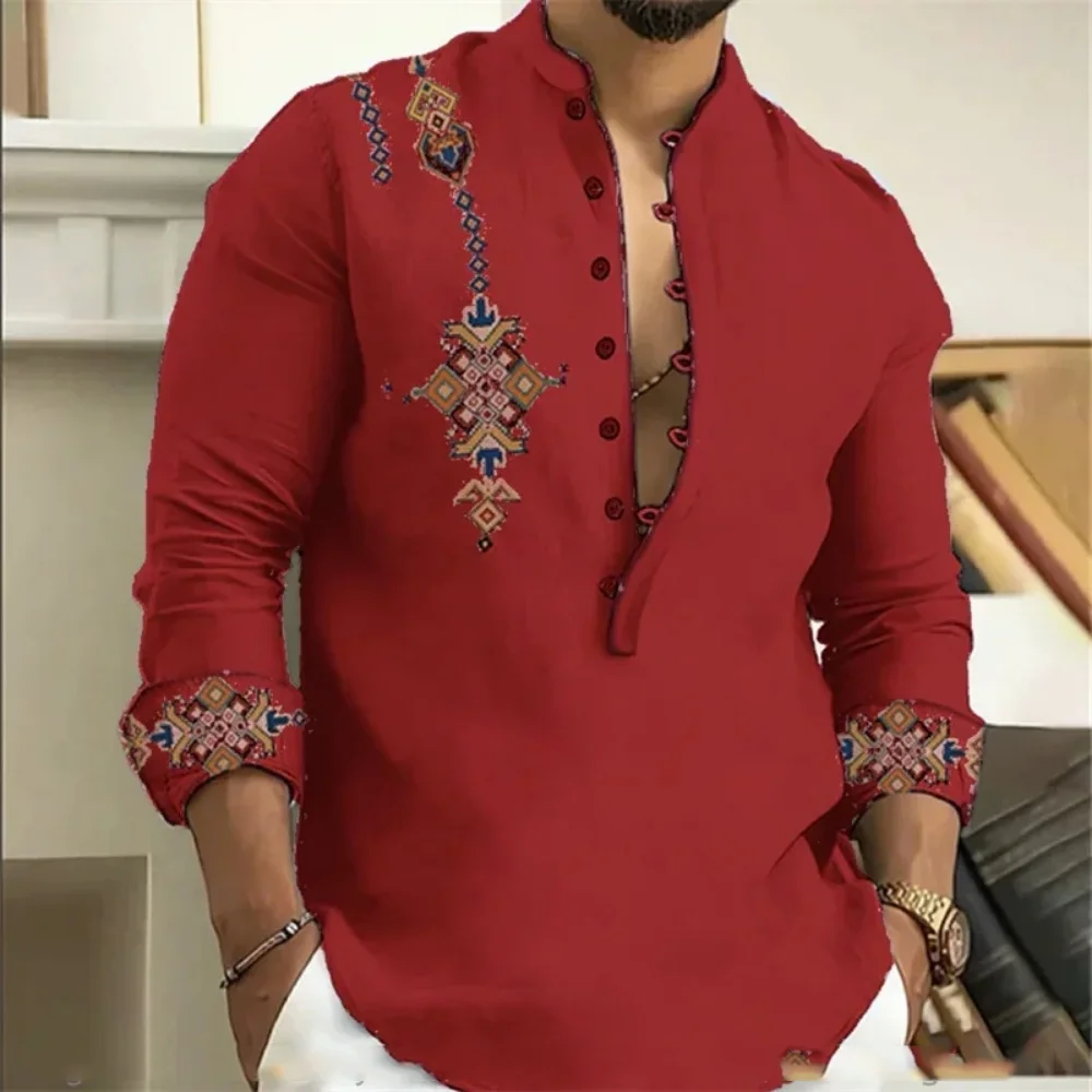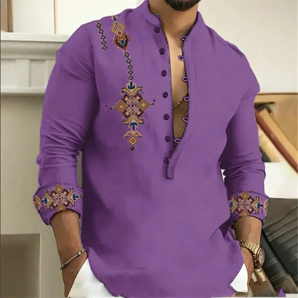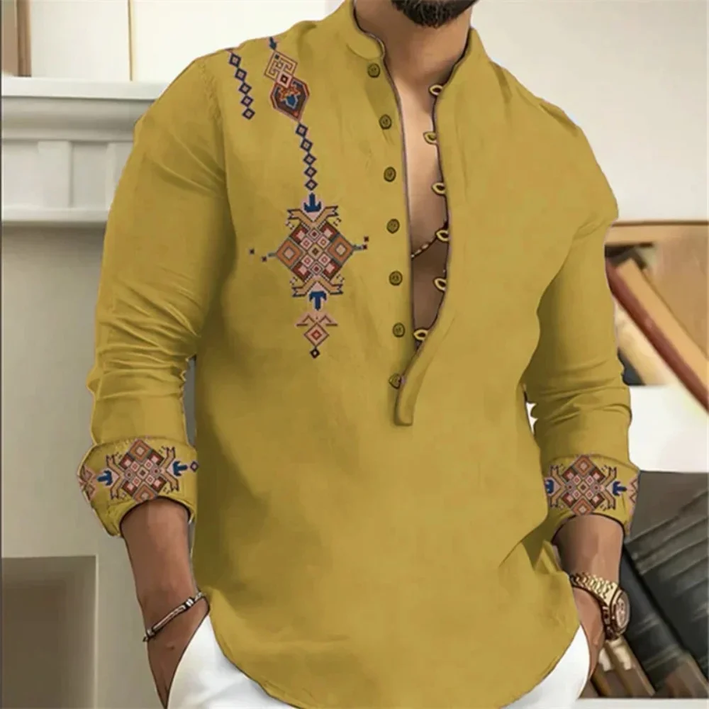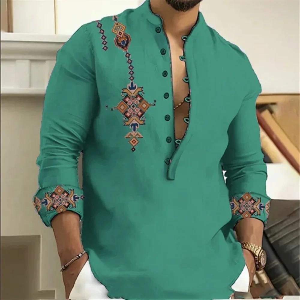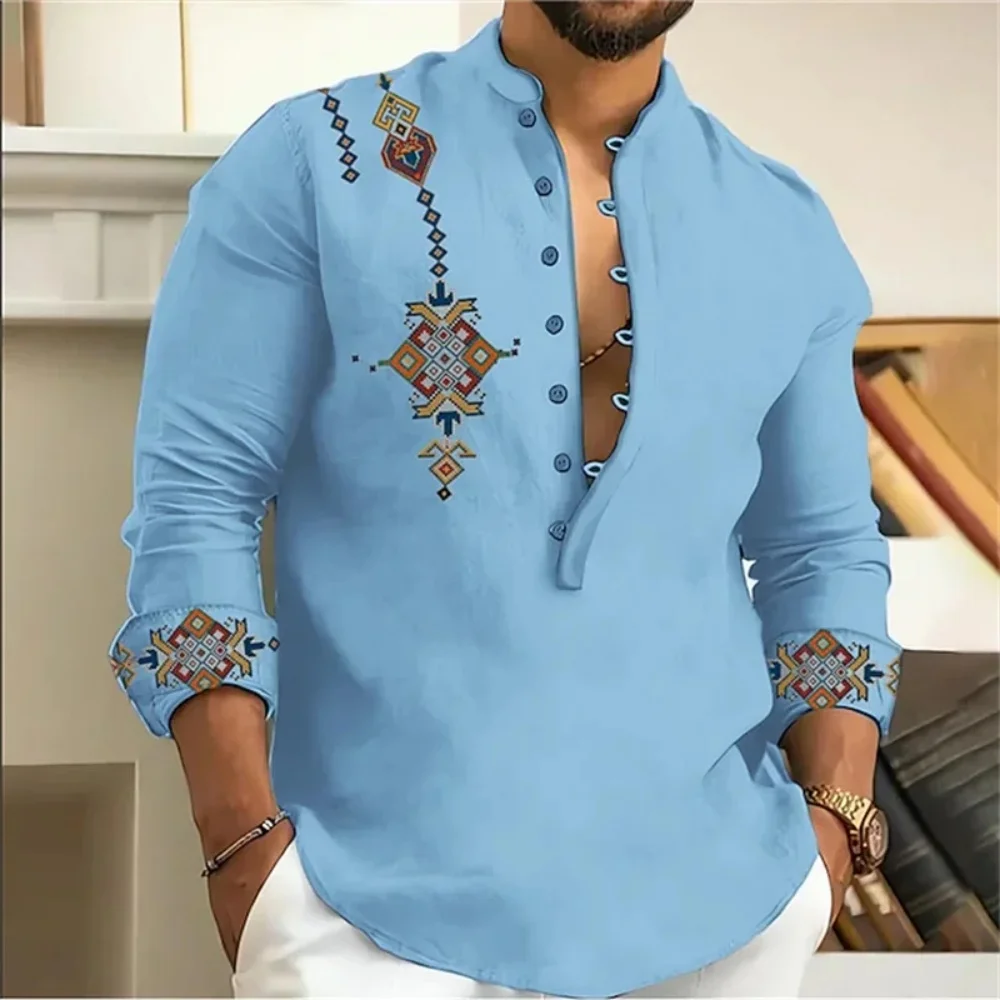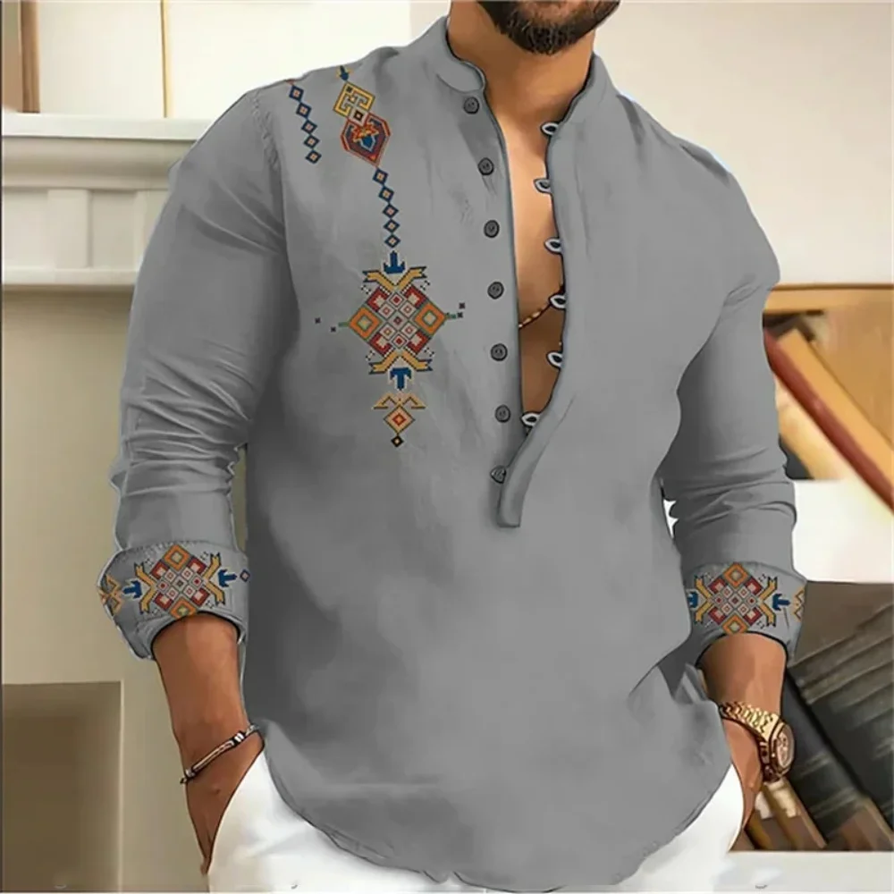 Embrace bold style with this men’s tribal print shirt. The retro geometric collar adds a unique touch, while the oversized fit and long sleeves offer comfortable, all-day wear, perfect for any outdoor adventure. Available in XS-6XL, ensuring the perfect fit